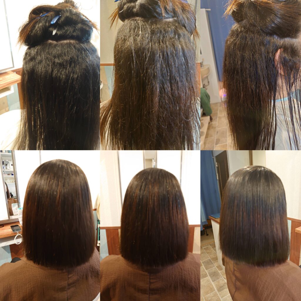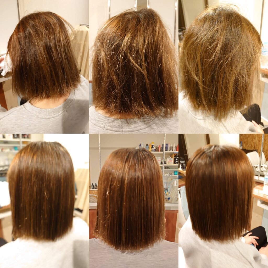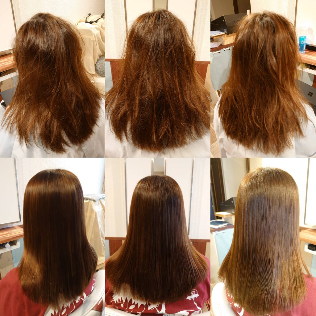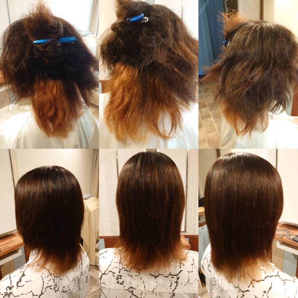 日本一優れた縮毛矯正薬剤をメインに使用した縮毛矯正の技術であり、髪を回復させる魔法の技術、薬剤を使用しているわけではありません。むしろ全国どこを探しても髪を回復させる技術、薬剤、商材は絶対に存在しません。お客様のダメージレベルによっては、一発で、もしくは段階的にキレイにできますが、傷んだ髪は絶対に回復しません。その事をしっかりご理解したうえでの御来店をお願いします。